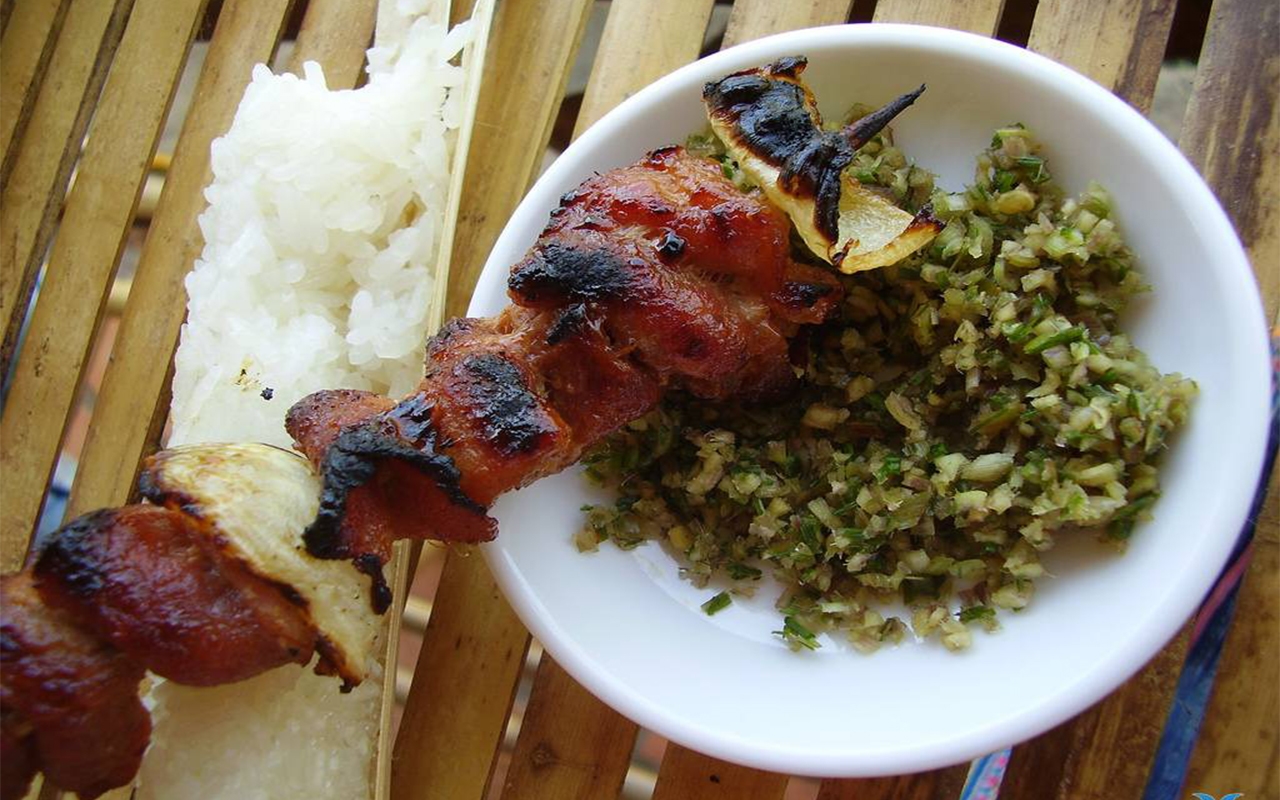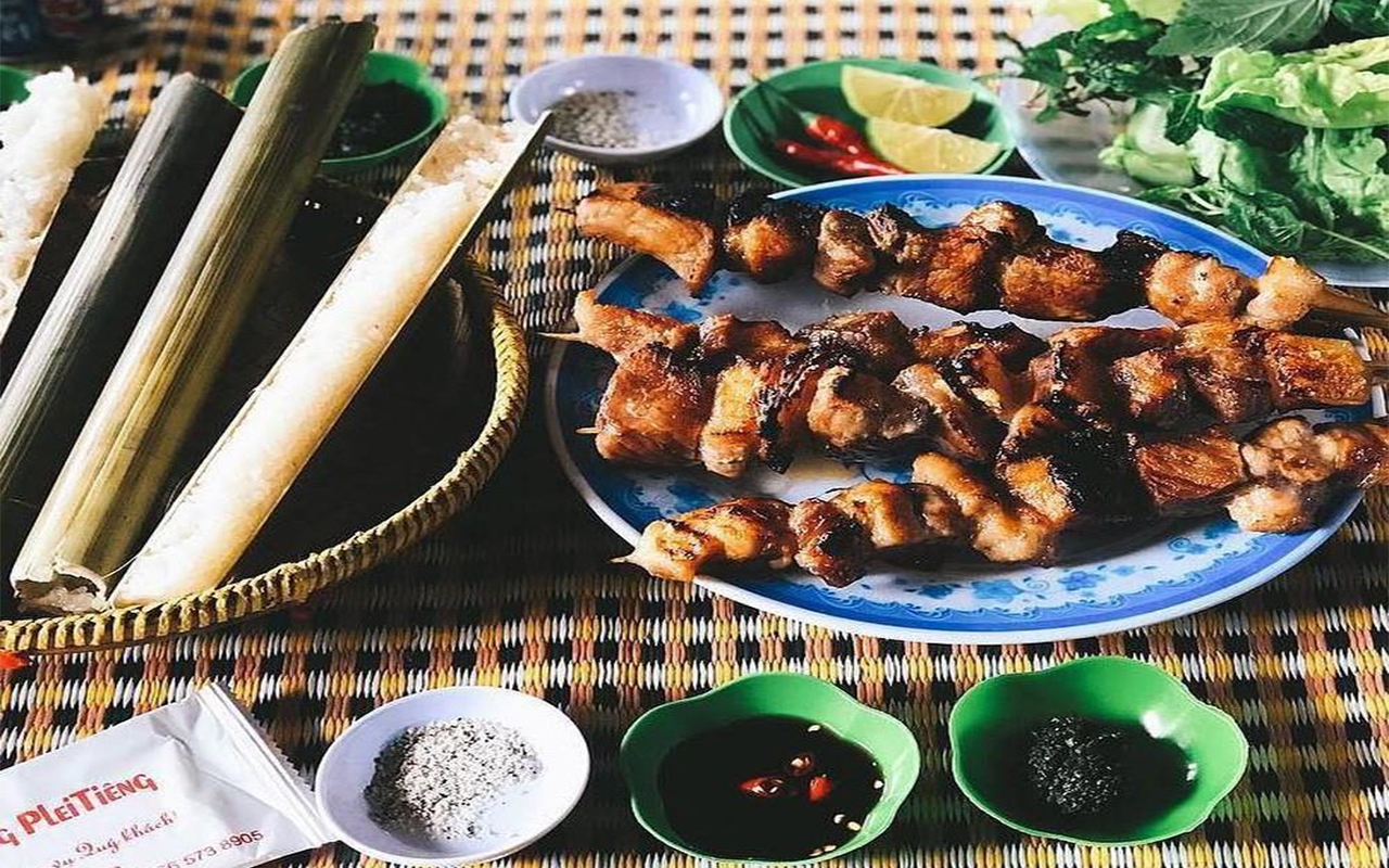 Đi cùng với cơm lam chính là thịt nướng, cũng từ thịt gia súc, gia cầm nhưng thường chế biến theo một cách rất riêng. Phần lớn nguyên liệu được nướng trên than, không ướp tẩm gia vị mà xiên que hoặc để vào ống lồ ô và nướng. Cách chế biến này tốn ít thời gian, thuận lợi cho việc đi rừng, đi rẫy... Khi ăn, người ta hay chấm với muối ớt.