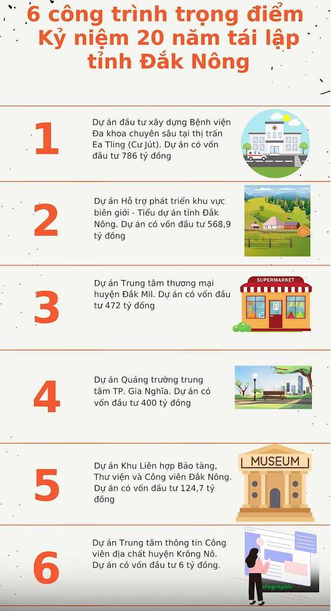 Tỉnh Đắk Nông lựa chọn 6 công trình trọng điểm nằm trong danh mục dự án chào mừng Kỷ niệm 20 năm Ngày tái lập tỉnh. Tổng vốn đầu tư các công trình lên tới hơn 2.356 tỷ đồng.
