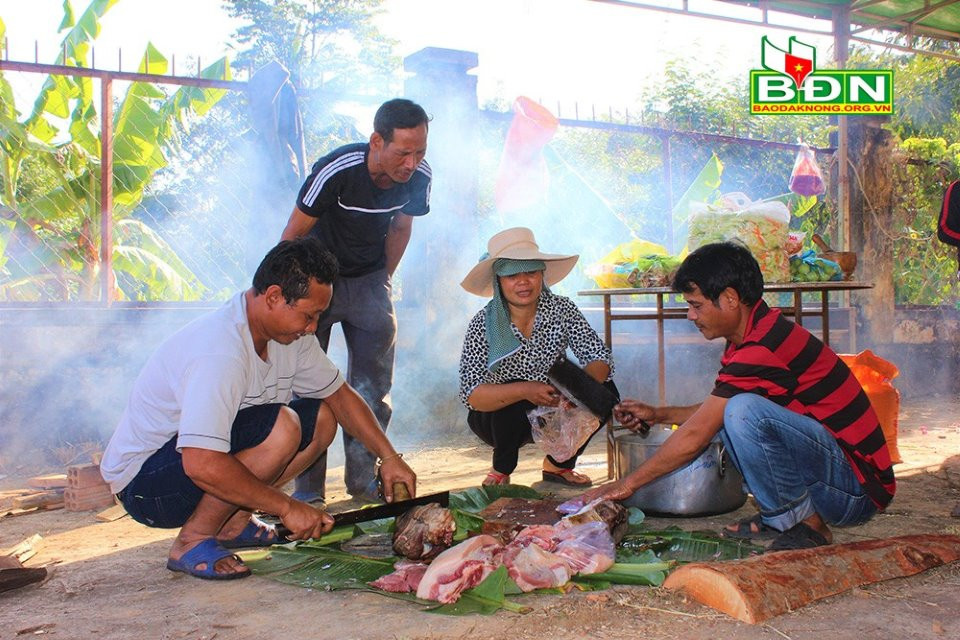Sau khi mổ heo, người Ê đê chọn một phần thịt vai và sườn non để làm món thịt băm gói lá chuối nướng |