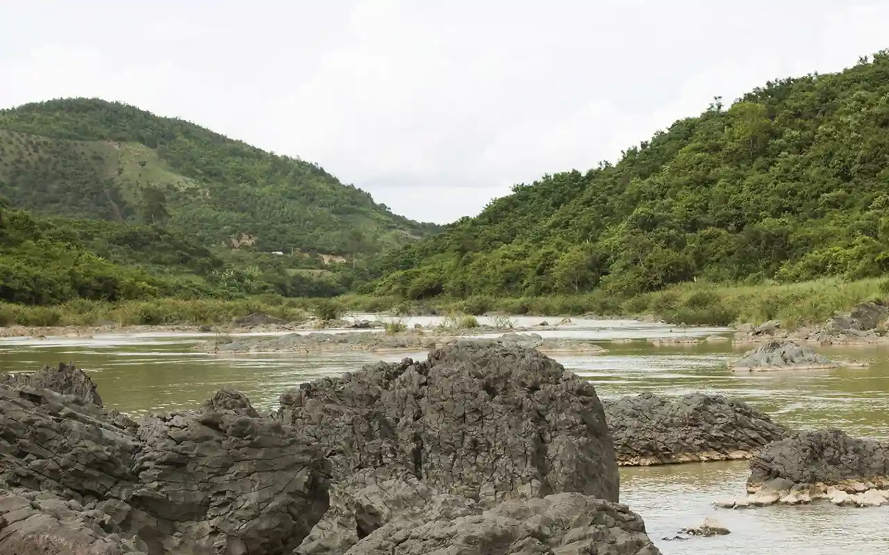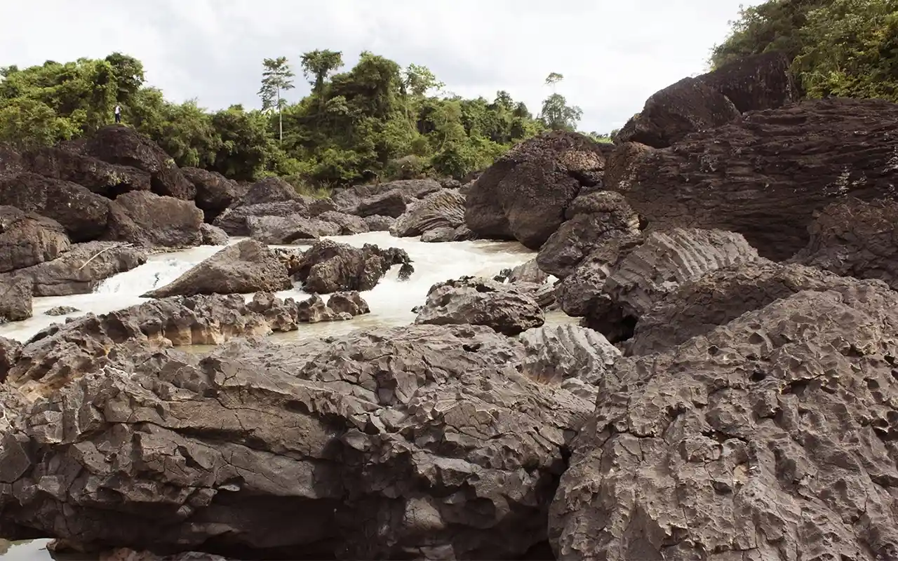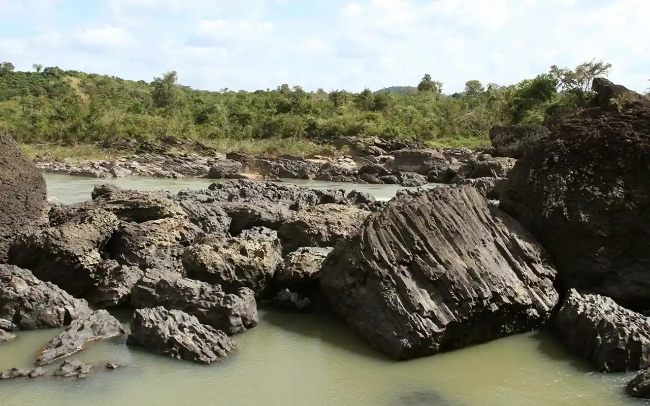 Đặc biệt, nơi đây còn có những tảng đá basalt có dạng cột với kích thước 10 – 30cm, cao hàng chục mét. Sự hiện diện của đá basalt cột là bằng chứng cho quá trình nguội lạnh, kết tinh từ từ và co rút thể tích đồng đều trong điều kiện môi trường bình ổn. Đá basalt cột bị uốn cong còn là bằng chứng cho quá trình nguội lạnh nhưng dòng dùng nham vẫn đang trong trạng thái chảy nhẹ, chưa dừng hẳn. Lớp cuội sạn bị phong hóa loang lổ nằm dưới basalt cho thấy dấu hiệu của thềm sông cổ bị phun trào basalt Pliocene phủ lên trên.
